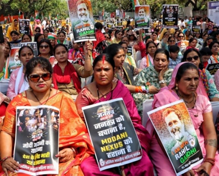 NEW DELHI:The All India Mahila Congress (AIMC) on Monday held a 'Jantantra Bachao Rally' to protest against the disqualification of Rahul Gandhi from the Lok Sabha following his conviction in a 2019 criminal defamation case.