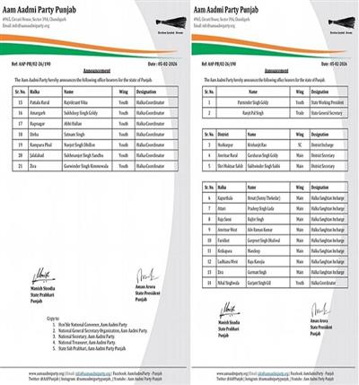 AAP Punjab Announces Key Organisational Appointments Across State, District and Halka Levels